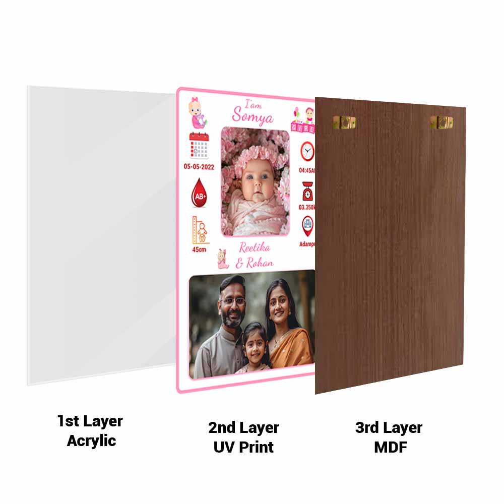 Custom newborn baby frame with name & birth details. Premium acrylic UV print keepsake, perfect for baby gifts & nursery décor.